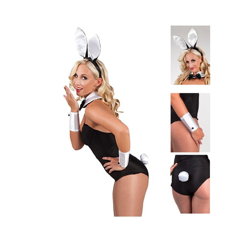 Costume de lapine sexy . Le costume de lapine sexy est composé de 4 pièces : les oreilles de bunny, blanches devant et noires derrière ; une petite queue en boule qui pourra être accrochée à n'importe quel pantalon à l'aide de la petite aiguille ; un col blanc avec un nœud papillon noir et enfin deux manchettes. Voilà de quoi est fait ce joli set qui vous transformera en sublime lapine !